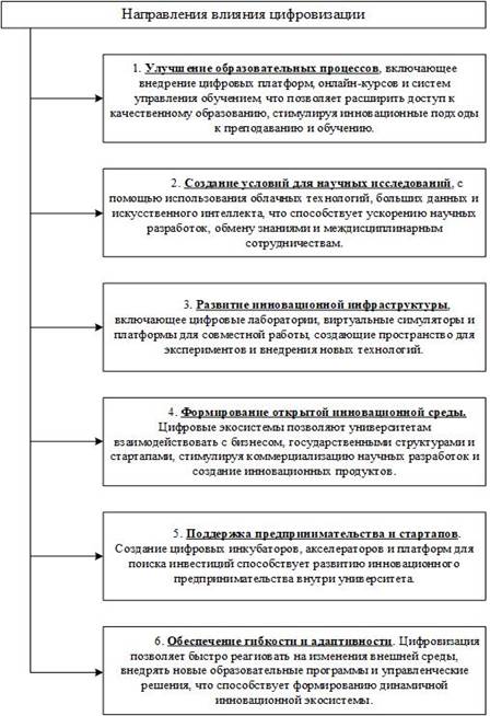 Так как развитие цифровизация охватывает многие сферы, а также проникает и в сферу высшего образования, и в следствии формирует инновационную цифровую экосистему университета, создавая условия для более эффективного взаимодействия, развития и внедрения новых технологий. Основные направления влияния цифровизации отображены на рисунке 3.