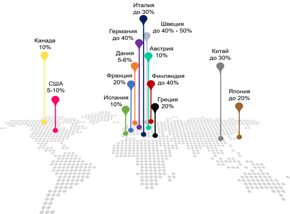 В то же время в зарубежной практике не выработан единый, унифицированный и формализованный подход к государственной ценовой политики (категории товаров, продолжительность, алгоритм действия перекрестных мер и методов и т.п.), в связи с чем для различных государств характерен дифференцированный подход не только к способам и методам применения инструментов и механизмов государственной ценовой политики, но и к доле товаров, цены на которые регулируются государством. В разные моменты времени диапазон регулируемых цен варьировался от 5% до 40% [1]. Удельный вес регулируемых (контролируемых) государством цен в отдельных зарубежный странах в разные моменты времени представлен на рисунке 1.