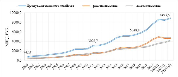 Динамика объёмов производства в сельском хозяйстве в Российской Федерации с 2000 г. по 2024 г. имеет положительную динамику. При этом с после 2014 г. наблюдаются более высокие темпы прироста производства сельскохозяйственной продукции (рис.1).