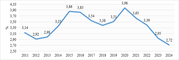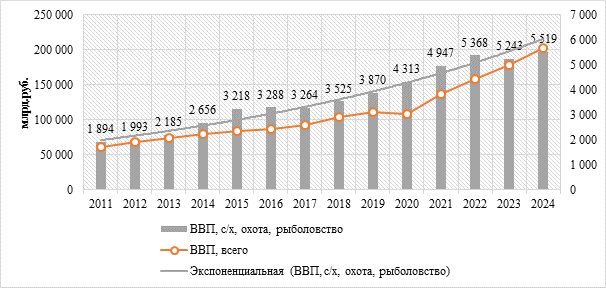 Вклад сельского хозяйства в валовой внутренний продукт (ВВП) представляет важный индикатор экономической структуры государства и степени его продовольственной безопасности. Анализ динамики ВВП позволяет оценить эффективность аграрной политики, уровень развития агропромышленного комплекса и его влияние на макроэкономическую стабильность (рис.2).