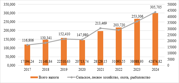 Рис. 4 – Налоги всего и сельского хозяйства, лесного хозяйства и рыболовства Российской Федерации