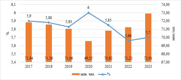 Занятость в сельском хозяйстве России в 2023 г. составила 5,70% всех занятых. В 2022 г. она была равна 5,66%. Это первый год роста после падения. За все время ведения статистики с 1991 г. этот показатель уменьшился в 2,12 раза. Максимальная численность занятых в аграрном секторе в России была зафиксирована в 1999 г. со значением 15,01% всех занятых. Самое низкое значение наблюдалось в России в 2022 г., когда оно было равно 5,66% [30] (рис.6).