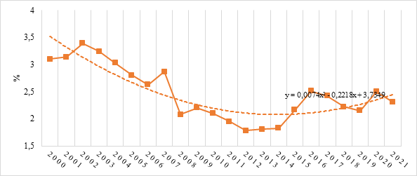 Рис. 3 – Доля сельского хозяйства, лесного хозяйства и рыболовства в ВВП Российской Федерации