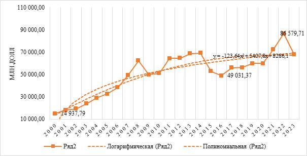 Добавленная стоимость в сельском хозяйстве России в 2023 г. составила 67,7 млрд долл., что на 21.82% меньше, чем в 2022 г., когда она была равна 86,6 млрд. долл. (рис.9). Это первый год падения после роста. За весь период имеющихся данных с 1989 г. этот показатель уменьшился в 1,17 раза. Максимальный уровень объема агропромышленного производства России был достигнут в 2022 г. со значением 86,67 млн долл. Самое низкое значение в России наблюдалось в 1999 г., когда оно составило 12,9 млрд. долл. добавленной стоимости ВВП [1; 29; 34].