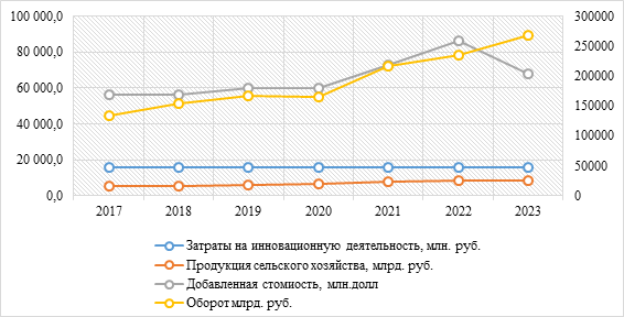 Сбор данных стал первоначальной частью исследования взаимосвязи между затратами на инновации и экономическими результатами в сельском хозяйстве. Были выбраны основные параметры для анализа, такие как объемы инвестиций в инновации, уровень производства сельскохозяйственной продукции, оборот предприятий, добавленная стоимость и другие показатели. Источники данных включали официальные статистические отчеты, исследования и результаты опросов, что позволяло обеспечить достоверность и всесторонность собранной информации [1; 30; 41; 45].