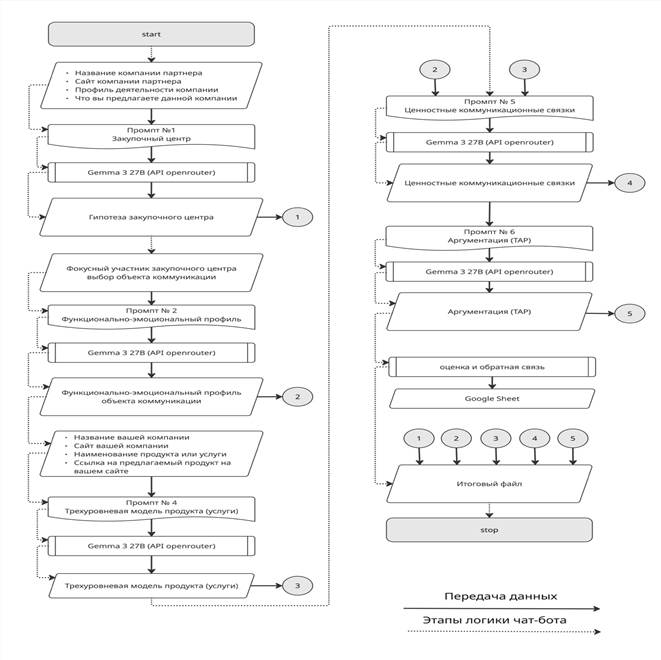 Цель настоящего исследования — создание и последующее использование чат-бота на основе генеративной языковой модели искусственного интеллекта (ГИИ) для создания ценностных предложений в сфере B2B. В рамках работы решены три задачи: проведён анализ литературы для выявления актуальных направлений использования ГИИ в B2B-коммуникациях; разработана методология формирования гипотез и аргументации на базе ГИИ; проведена апробация методологии на примере созданного чат-бота. Методология включает пять этапов: идентификацию закупочного центра, построение функционально-мотивационного профиля участников, формирование трёхуровневой модели восприятия продукта, генерацию ценностных коммуникационных связок и построение аргументации по модели ТАП. Апробация в реальных условиях (116 участников, 166 сессий) показала сокращение времени подготовки аргументации более чем на 60 %, высокую оценку применимости инструмента (средний балл 8,8 из 10, NPS +62,5) и подтверждение его готовности к масштабированию.