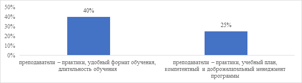 Также было выявлено, что важность характеристик для выбора, оцениваемая респондентами в вопросах анкеты отдельно (в отрыве от необходимости комплексного принятия решения), значительно отличается от результатов ответа на вопрос «какой набор характеристик будет ключевым для принятия решения о заключении договора». Так, например, в качестве наиболее важных характеристик, влияющих на выбор программы, 75% респондентов назвали участие преподавателей-практиков, 62% – учебный план, 54% – удобный формат обучения. При этом никто из них не указал именно эти параметры в сочетании – как ключевой набор для принятия окончательного решения (заключения договора об обучении). Наиболее часто встречались комбинации: преподаватели – практики, удобный формат обучения, длительность обучения (40%); преподаватели – практики, учебный план, компетентный и доброжелательный менеджмент программы (25%); удобный формат обучения, преподаватели – практики, возможность трудоустройства после прохождения программы (10%); удобный формат обучения, компетентный и доброжелательный менеджмент программы, длительность обучения (10%) (рис. 3).