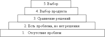 «Лестница узнаваемости» Бена Ханта (рис. 5) – пятиступенчатая модель поведения клиента (потенциального слушателя), приводящая его от неосознанности проблемы к ее решению посредством сделки (отсутствие проблемы; есть проблема, нет решения; сравнение способов решения; выбор продукта; уверенное намерение и заключение сделки). Ее использование позволит образовательной организации создавать лучшие ценностные предложения для конкретной аудитории в зависимости от уровня осознания клиентом своей потребности и проблемы, отслеживать, насколько потенциальный слушатель готов к покупке, чтобы предложить именно то, что ему нужно. Это даст потенциальным потребителям ощущение, что представители образовательной организации понимают и ориентированы на их потребности и запросы. Каждая ступень лестницы требует особого подхода к потенциальному слушателю, так как его потребности будут отличаться на разных этапах.