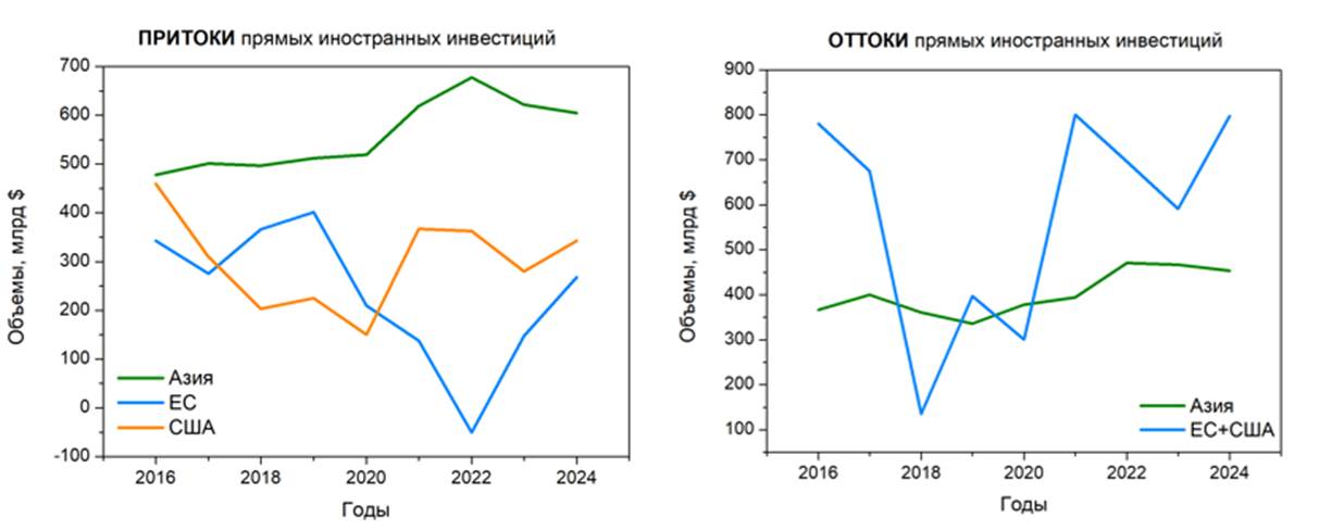 Рисунок 1 – Притоки и оттоки ПИИ по азиатскому региону, ЕС и США, 2016-2024 гг., млрд долларов США