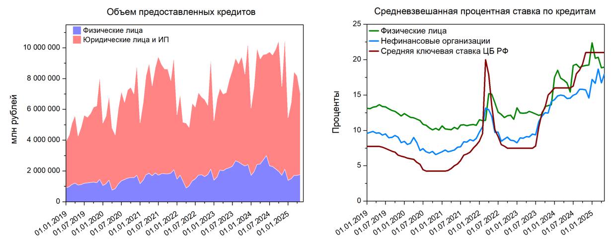 Последние несколько лет, начиная с 2019 г. денежно-кредитные условия в России характеризуются повышенным уровнем ставок. Жесткая денежно-кредитная политика Банка России делает кредит менее доступным для компаний и населения (рисунок 2). Статистические данные по процентным ставкам и объемам, предоставленных кредитов подтверждают выраженную стагнацию. Крайне высокая ключевая ставка отразилась на стоимости кредитных ресурсов, что привело к фиксации объемов выданных кредитов не выше 7–8 трлн рублей за период 2022–2025 гг.