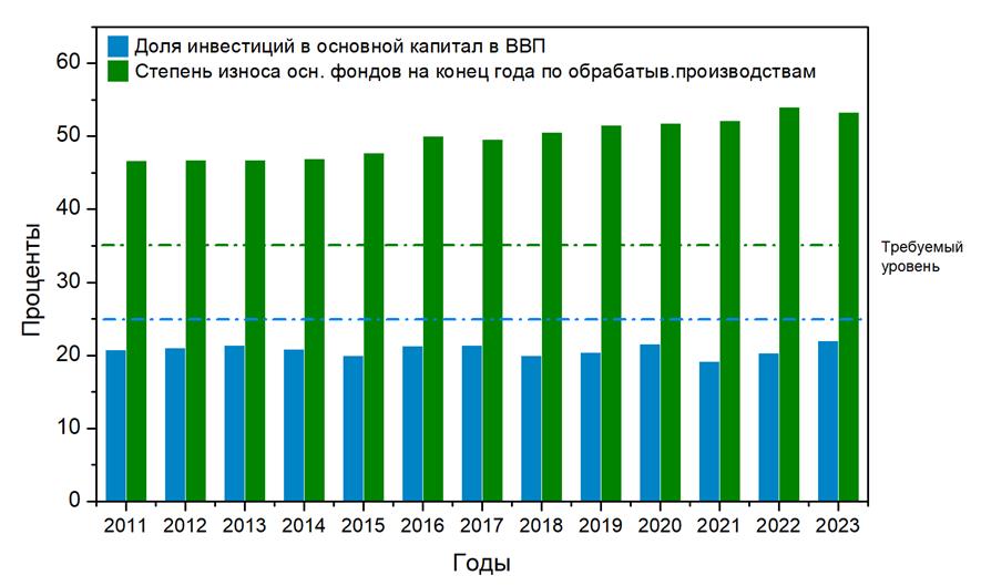 Рисунок 3 – Инвестиции и степень износа основных фондов по РФ и обрабатывающим производствам, проценты, 2011–2023 гг.