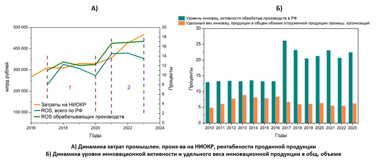 За последние 10 лет уровень инновационного развития в РФ не показывает в основном ощутимой положительной динамики. Несмотря на скачок уровня инновационной активности в 2016–2017 гг., последние несколько лет наблюдается стагнация. В тоже время наблюдается рост внутренних затрат промышленного производства на научные исследования и разработки (НИОКР). При этом положительные тенденции указанных двух показателей не позволяют российским компаниям получить итоговый положительный финансовый результат. Удельный вес инновационных товаров, работ и услуг в общем объеме отгруженных товаров по-прежнему сохраняется на уровне 6-7% (рисунок 4), а рентабельность проданной продукции в основном стагнирует (рисунок 4А, отрезки 1 и 2) за исключением периода роста уровней между 2020 и 2021 гг.