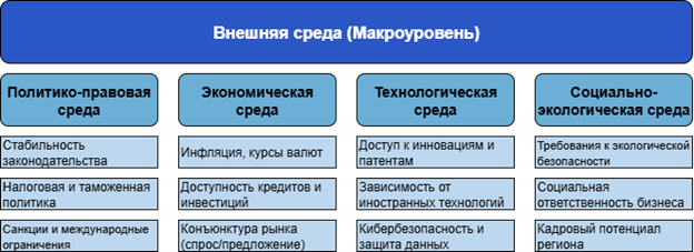 Макроуровень системы экономической безопасности представляет собой совокупность всех аспектов, которые могут оказывать влияние на производство «извне» и требовать адаптации бизнес-процессов: политико-правовая среда, экономическая среда, технологическая среда и социально-экологическая среда (рис. 1).