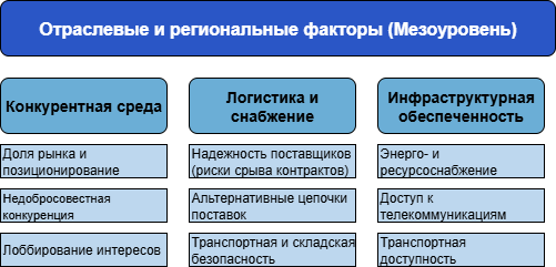 Следующая ступень – мезоуровень, на котором представлены отраслевые и региональные факторы. Их анализ дает понимание о положении предприятия в отрасли и регионе. В разрезе системы экономической безопасности к ним можно отнести: конкурентную среду, логистику и снабжение, инфраструктурную обеспеченность (рис. 2).