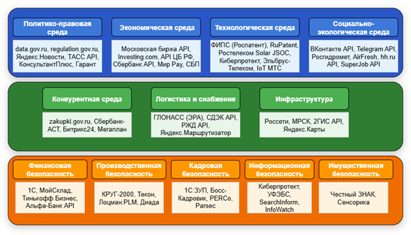 Предложенная модель позволяет системно оценивать угрозы экономической безопасности производства на разных уровнях детализации. Для интеграция подобной модели системы экономической безопасности в цифровой двойник предприятия необходимы информационно-технические средства за счет которых будет возможно в режиме реального времени получать показатели по ключевым аспектам, на основании которых и будет проводится аналитика. Метод сбора данных определяется спецификой компонентов анализируемого предприятия. В контексте данной работы приведем возможные системы сбора данных, ориентированные на ключевые аспекты экономической безопасности (рис. 4).