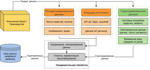 Концептуальная модель цифрового двойника для прогнозирования угроз экономической безопасности представляет собой комплексную систему, которая на вход получает полный спектр данных, отражающих состояние экономической безопасности физического объекта. Полученные данные проходят процесс предварительной обработки с использованием технологий Big Data [1].