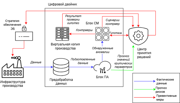 Методами предиктивной аналитики интегрированными в цифровой двойник производится анализ данных на предмет выявления аномалий или критических значений, обучение математических моделей на исторических данных для прогнозирования рисков возникновения угроз по целевой переменной (ключевому показателю) и оценка влияния возможного риска по принципу каскада на признаки (показатели, которые коррелируют с ключевым) [2]. Все полученные прогнозы передаются центру реагирования для разработки мер превентивной защиты.