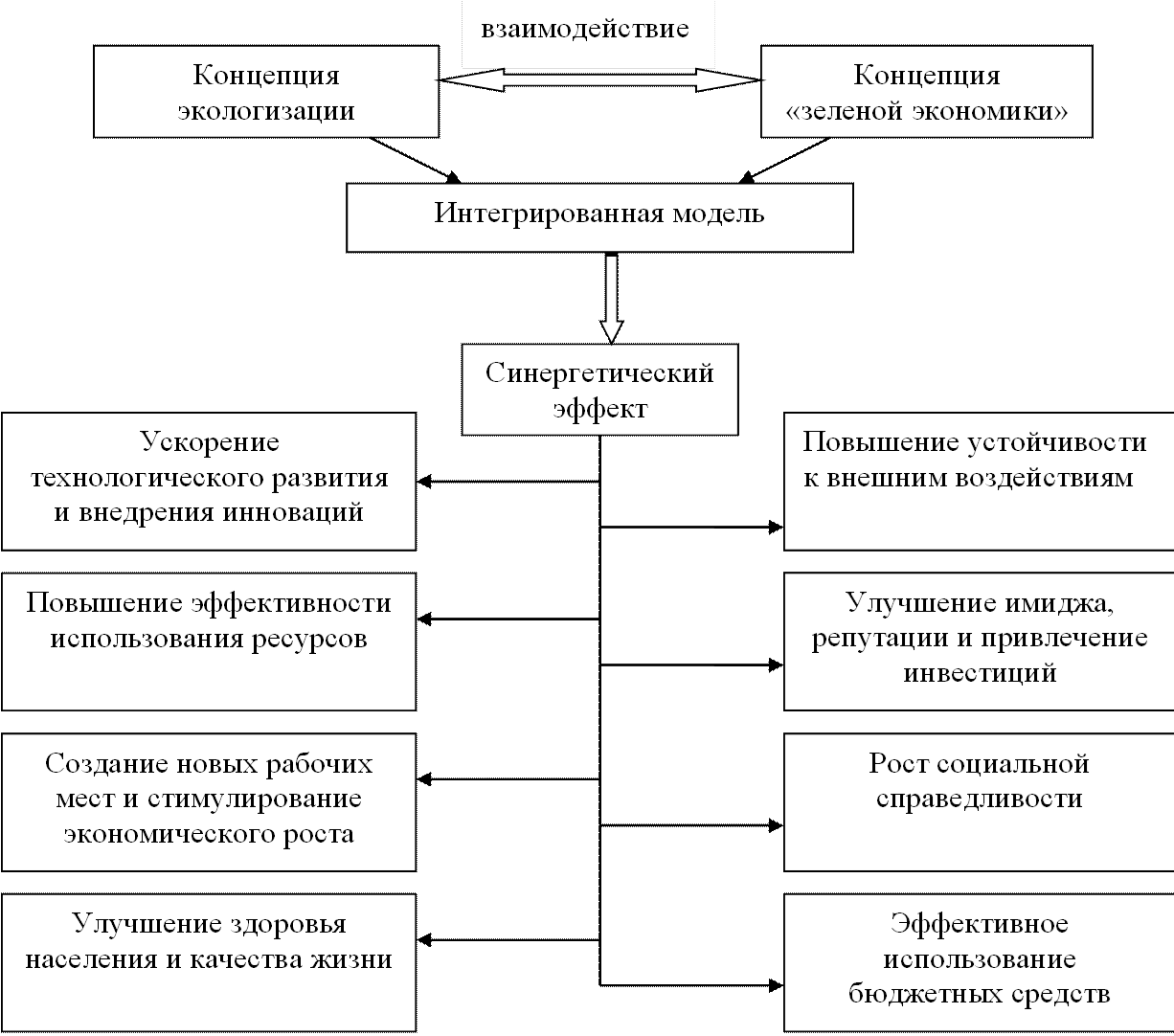Соблюдение названных принципов при взаимодействии двух концепций – экологизации и «зеленой» экономики позволит добиться синергитического эффекта, который усилит позитивные результаты в решении экологических и экономических задач. Данным эффектом будет обладать интегрированной модель, которая сможет усилить влияние каждой концепции и получить лучший вариант как для экономического развития, так и для охраны окружающей среды.