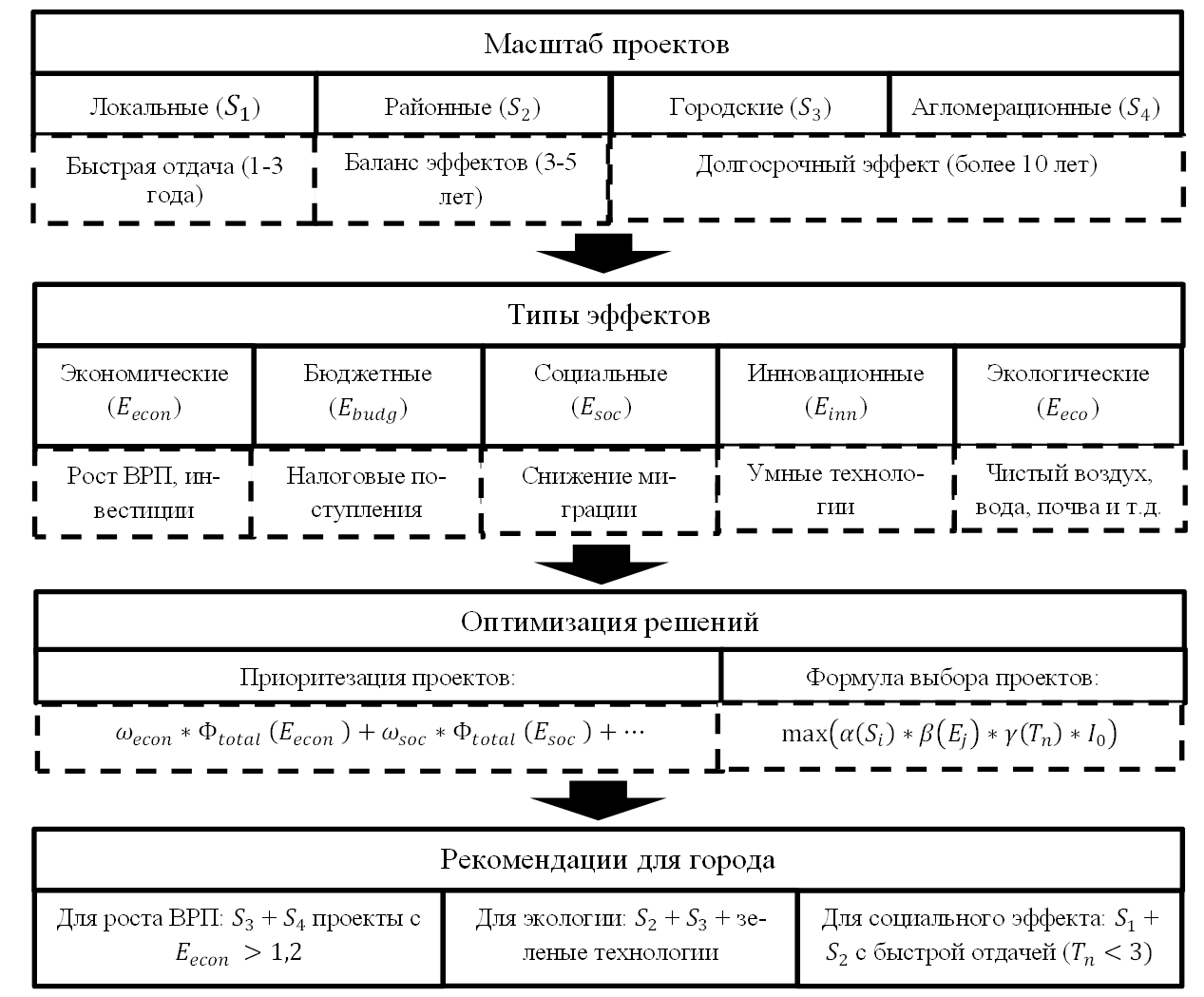 Предложенные модели – это инструмент для принятия решений, который превращает качественные цели («сделать город комфортнее») в количественные показатели. Например, если на урбанизированной территории необходимо увеличить ВРП на 5 % за 5 лет, тогда следует сфокусироваться на проекты городского и агломерационного уровня с высоким экономическим эффектом. Или если же следует снизить уровень стресса жителей, то инвестиции следует направить в проекты локального и районного уровней с быстрой отдачей в части социальных эффектов.