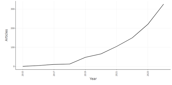 Из базы данных Scopus было извлечено 956 исследований, которые были проанализированы с помощью базы данных Scopus и программы Biblioshiny из пакета Bibliometrix R. Целью исследования было выявление и анализ ключевых тенденций, наиболее популярных ключевых слов, влиятельных стран в данной области. Были получены следующие результаты.
