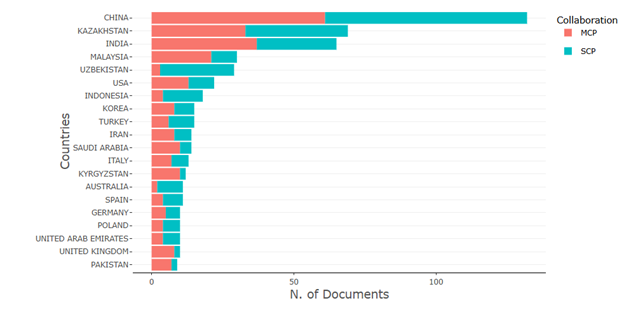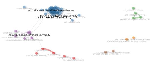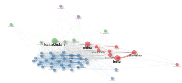 Большинство публикаций поступило из Казахстана, который обладает самой сильной научной инфраструктурой в регионе, за ним следуют Узбекистан и Кыргызстан. Анализ также выявил свидетельства сотрудничества между международными исследовательскими обществами, особенно в азиатских странах. Видно, что наибольшее сотрудничество в этой области было между такими странами, как Казахстан, Китай и Узбекистан, Индия.