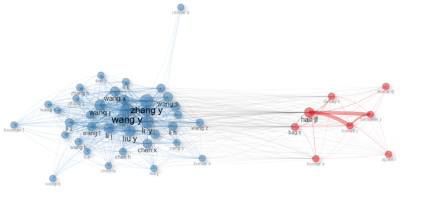 · Кластер 1 (красный) содержит влиятельные работы, в основном связанные с организационным поведением, методами бизнес-исследований и стратегиями цифровизации. В эту группу входят авторы, занимающиеся организационным поведением, моделированием структурных уравнений (SEM), цифровой трансформацией и устойчивым развитием в контексте управления.