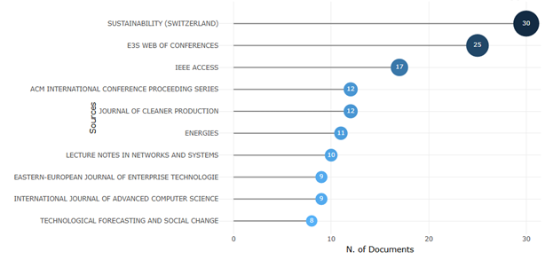 Самые цитируемые и наиболее распространенные журналы по результатам анализа. Список самых популярных журналов в этой области представлен на рисунке 6, и можно сказать, что журнал “Sustainability (Switzerland)” является лидером среди них.