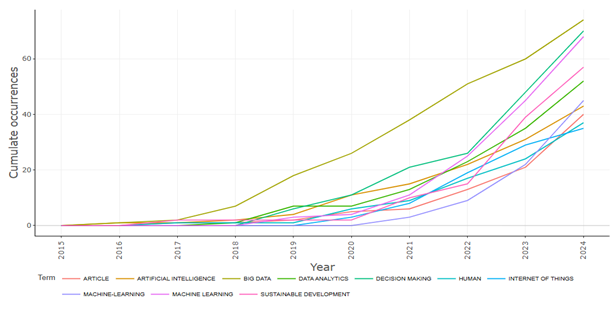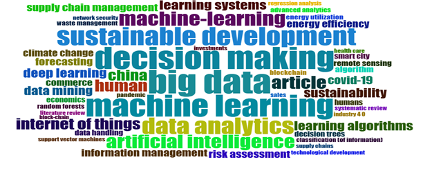 По результатам библиометрического анализа можно сказать, что самыми распространенными словами в этом направлении стали такие термины, как «большие данные», «принятие решений», «машинное обучение», «аналитика данных», «устойчивое развитие», «искусственный интеллект».