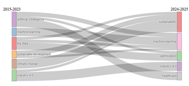 На основании результатов библиометрического анализа выявлено, что доминирующими направлениями научных исследований в рассматриваемый период являются искусственный интеллект, машинное обучение, большие данные и устойчивое развитие. В частности, в последние годы отмечается значительное расширение сферы применения концепта «большие данные», который все чаще интегрируется в исследования, связанные с устойчивым развитием, методами машинного обучения и задачами оптимизации. Это свидетельствует о возрастающем интересе научного сообщества к междисциплинарному использованию технологий обработки и анализа данных для решения актуальных прикладных и теоретических проблем.