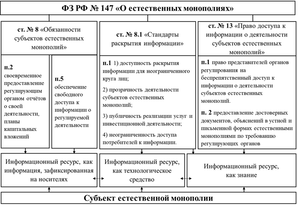 На представленной схеме условно сопоставлены формулировки законодательства с различными видами информационных ресурсов в управлении. Интерпретация полученных результатов в научном контексте состоит в следующем: под информационными ресурсами, как информацией, зафиксированной на физических электронных носителях, подразумевается документация субъекта естественной монополии, к которой его руководство должно обеспечить свободный доступ регулирующих органов. Информационный ресурс, как технологическое средство хранения и передачи информации, должен обеспечивать доступность, прозрачность, публичность и неограниченный доступ к информации для всех заинтересованных сторон. Обеспечение доступа к информации о деятельности естественной монополии по таким критериям практически невозможно представить без введения инновационных методов управления информационными потоками. Информационный ресурс, как знание, предполагает раскрытие информации субъектом естественной монополии о своей деятельности не только в ключе официального информационного обмена в виде документации, то есть посредством формализованного знания, но и в виде устных ответов на запросы регулирующих органов и средств массовой информации, то есть посредством неформализованного знания.