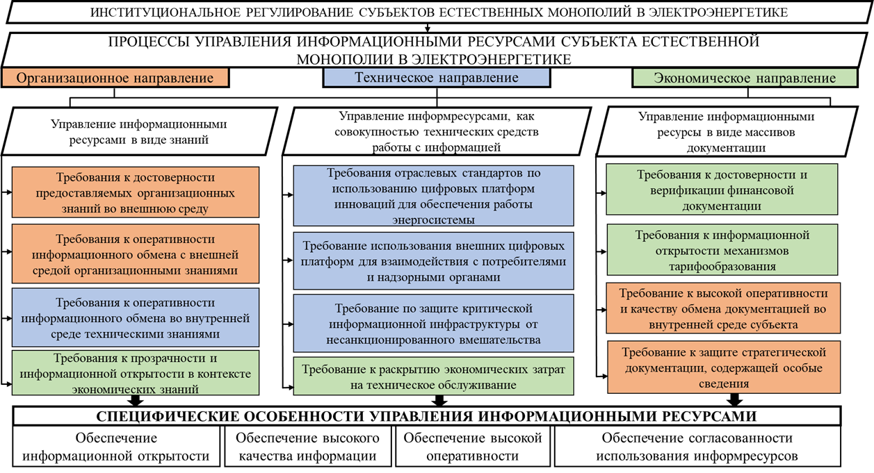 На представленной схеме показано, что основными специфическими особенностями управления информационными ресурсами в субъектах естественных монополий в электроэнергетике в контексте институционального регулирования являются: обеспечение информационной открытости информационных ресурсов, как знаний и как документации перед надзорными органами и потребителями в целях защиты общественных интересов; обеспечение высокого качества информационных ресурсов подразумевает достоверность, прозрачность и верификацию сведений в документации, передаваемой во внутренней и внешней среде субъекта, так как от сведений (формализованных знаний), содержащихся в информационных ресурсах в виде документации будет зависеть надёжность функционирование и модернизация электросетевого комплекса и электрогенерации. Обеспечение высокой оперативности информационного обмена заключается в своевременном обмене информационными ресурсами как знаниями и как документацией во внутренней среде субъекта, в межорганизационном взаимодействии и во внешней среде с группами заинтересованных сторон. Обеспечение согласованности использования информационных ресурсов, в большей степени, относится к управлению многочисленными техническими средствами работы с информацией в субъектах, которые не должны конфликтовать между собой и не иметь системных сбоев в целях обеспечения предыдущих рассмотренных требований, а также для высокой надёжности функционирования энергетической системы. Обеспечение защиты данных не является специфическим требованием к информационной среде рассматриваемых субъектов в контексте их институционального регулирования, так как данная особенность присуща большинству крупных хозяйствующих субъектов.