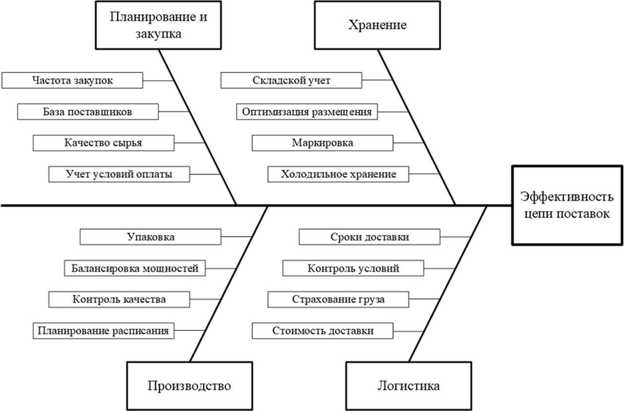 диаграммы Исикавы (рис. 2), позволяющей систематизировать причинно-следственные связи, влияющие на эффективность цепи поставок скоропортящихся грузов.
