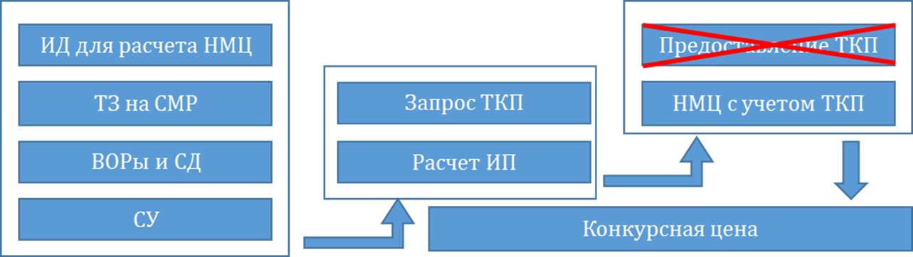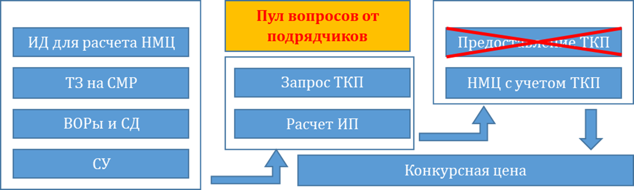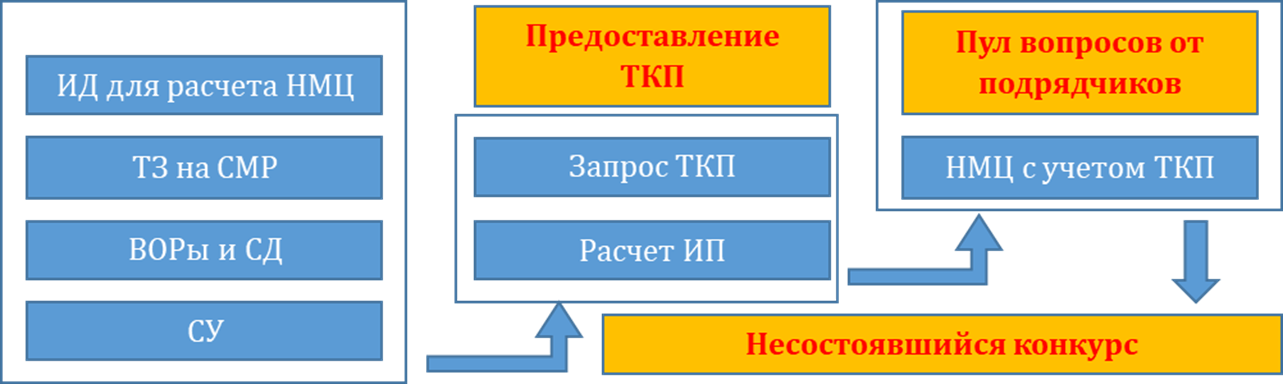 Направление потенциальными подрядчиками индикативных ТКП и последующее изменение цены на этапе конкурсной процедуры. Приведенная ситуация является продолжением первых двух блоков и заключается в том, что зарубежный подрядчик, желая принять участие к конкурсе на интересующий его объем работ, направляет свое индикативное ТКП в указанный в запросе срок, до конца не разобравшись в структуре документации, основных положениях ТЗ и существенных условиях выполнения работ. Далее следует этап «пула вопросов» от зарубежного подрядчика, ответы на которые приводят его на конкурс уже с другой ценой, значительно выше заявленной прежде в его индикативном ТКП. Соответственно, расчет НМЦ, выполненный с учетом его индикативного ТКП, значительно отличается от его конкурсного предложения и конкурс признается не состоявшимся, так как согласно конкурсным процедурам не принимаются заявки участников, которые выше предложенной НМЦ [4]. Схематично приведенная ситуация изображена на рисунке 4.