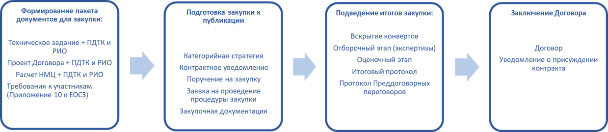 При этом, проведение обучающих семинаров для потенциальных подрядчиков страны сооружения и смежных стран заключается в разъяснении условий и правил формирования пакета документов для закупки (техническое задание, проект договора, расчет НМЦ, требования к участникам в соответствии с приложением 8 ЕОСЗ), подготовки закупки к публикации, подведения итогов закупки и заключения договора. Схематично приведенная ситуация изображена на рисунке 5.
