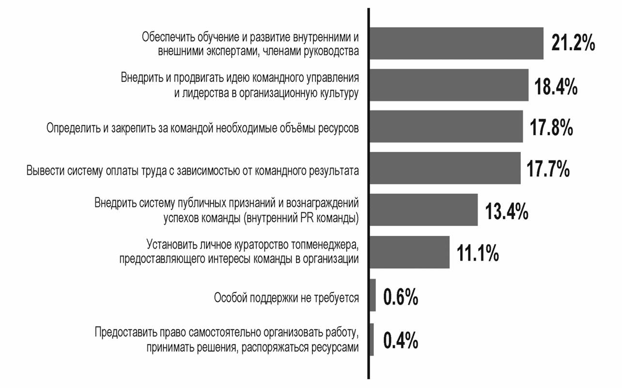 Особую значимость респонденты уделяют вопросам разнообразных форм поддержки (экспертной, моральной, организационной). Обратите внимание, что респонденты не озвучивали материальные формы поддержки команд. Вне зависимости от формы собственности компании, сегодня у руководителей (и, соответственно, сотрудников) многократно усиливается осознание того, что уже оформленные трудовые отношения демонстрируют признание каждого сотрудника инвестицией в будущее компании. А инвестиции должны работать. Ты платишь рубль, а хочешь получить минимум три взамен. Если вы наняли не эффективного сотрудника, который приносит вам тот же рубль или меньше – вы спонсор, а бизнес – это не благотворительность. Поэтому главная задача современного руководителя – создать условия для демонстрации контрастного результата командой (прим. авторов – по Долгову М. «контрастный результат – это результат, превосходящий ожидания» [9]).