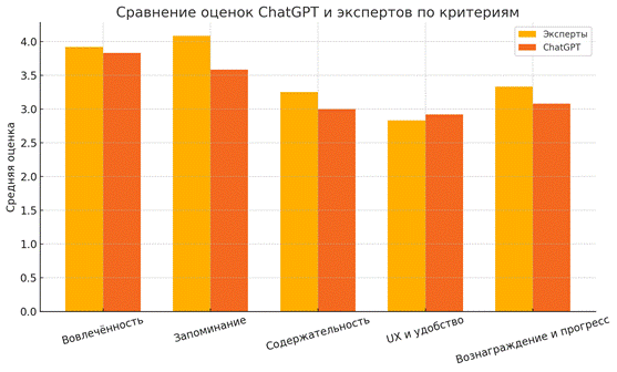 На рисунке выше визуализированы средние оценки, выставленные экспертами и моделью ChatGPT по пяти критериям. Как видно, различия между оценками невелики, наибольшее расхождение наблюдается по критерию "Запоминание".