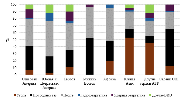 Одной из нескольких причин, по которым нефтегазовая промышленность или ископаемое топливо в целом является доминирующим в мировом энергетическом балансе заключается в том, что производство энергии из данного вида топлива дешевле, надежнее и проще в использовании и транспортировке по сравнению с другими энергетическими ресурсами. Если сравнить ископаемое топливо с другими источниками энергии с региональной и глобальной точек зрения, то нефть и природный газ занимают от 62% до 97% энергетического баланса для большинства регионов (рисунок 1). Таким образом, потребление энергии преимущественно обеспечивается за счет нефти и природного газа, а в Азиатско-Тихоокеанском регионе значительно доминирует уголь, составляя около 50% потребления.