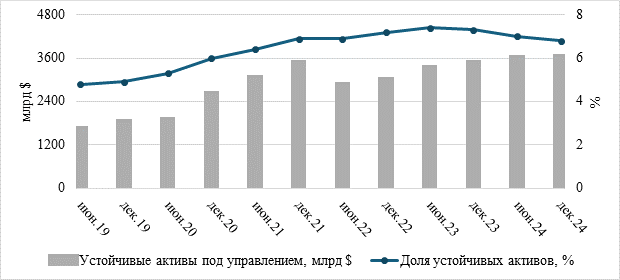 Как видно из анализа данных, представленных на рис. 2., во второй половине 2024 года активы под управлением фондов устойчивого развития выросли до нового максимума в 3,56 трлн $. Это произошло благодаря незначительному восстановлению притока средств в течение последних шести месяцев 2024 года, когда чистый приток составил 30,6 млрд $. Активы под управлением устойчивых фондов достигли рекордного уровня в 3,56 триллиона долларов к концу 2024 года, что на 0,9% больше по сравнению с июнем 2024 года и на 4,8% выше по сравнению с декабрем 2023 года [30]. Тем не менее, доля активов устойчивых фондов в общем объеме активов снизилась с 7,3% в 2023 году до 6,8% в 2024 году. Снижение в основном обусловлено более сильным и продолжающимся притоком средств в традиционные фонды.