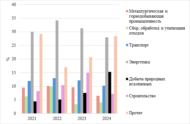 В период 2021-2024 гг. энергетика занимает лидирующие позиции, достигнув объема ESG-портфеля в 34,2% в 2022 году. В последующие годы наблюдается небольшой спад, что, по мнению авторов, связано с изменением структуры мировых инвестиций. Несмотря на общий рост инвестиций в «чистую» энергетику, в отдельных регионах и сегментах наблюдается замедление прироста в связи с недостатком финансирования «зеленых» проектов, дефицитом технологий и компонентов, а также регуляторной и экономической неопределенностью для инвесторов.