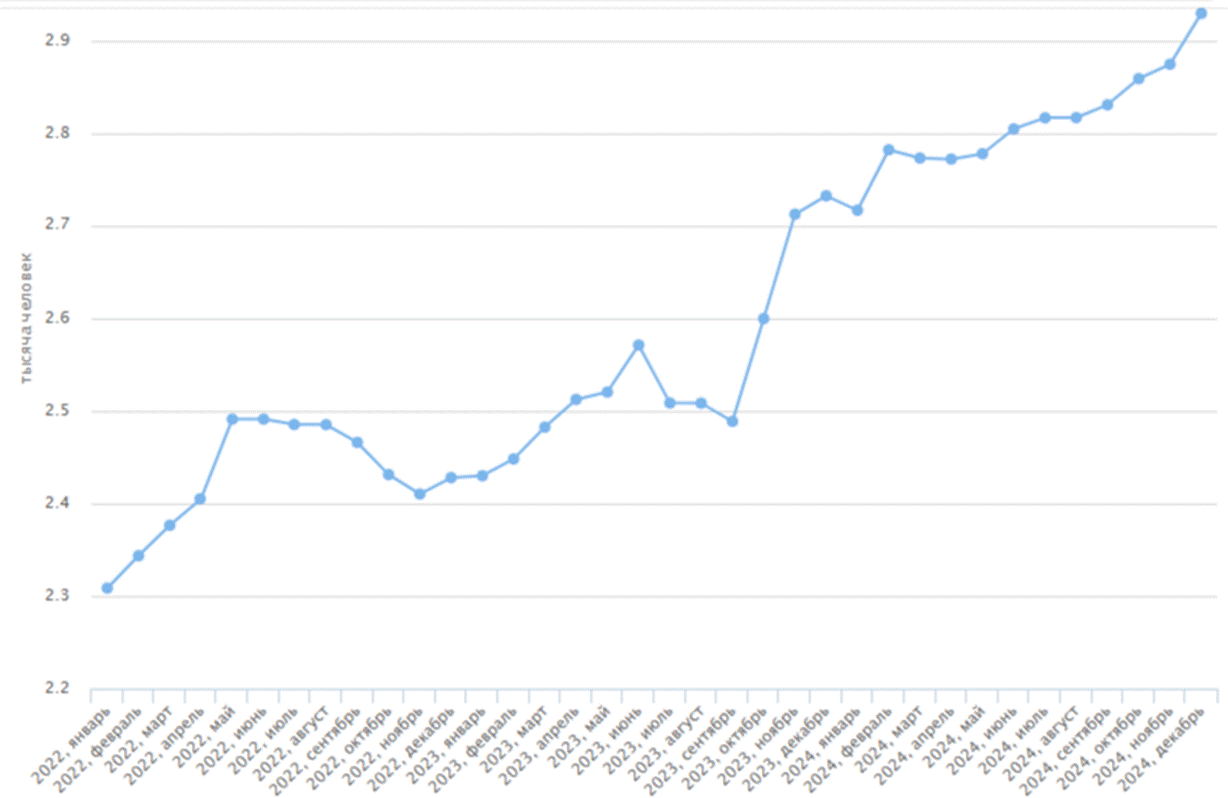 Так, согласно статистическим данным, представленным на рисунке 1, наблюдается заметный рост численности занятых в отрасли, начиная с октября 2023 года и по декабрь 2024 года, что можно объяснить результатами усилий со стороны государства, в том числе по улучшению инвестиционной привлекательности отрасли, а также ростом потребительского спроса.