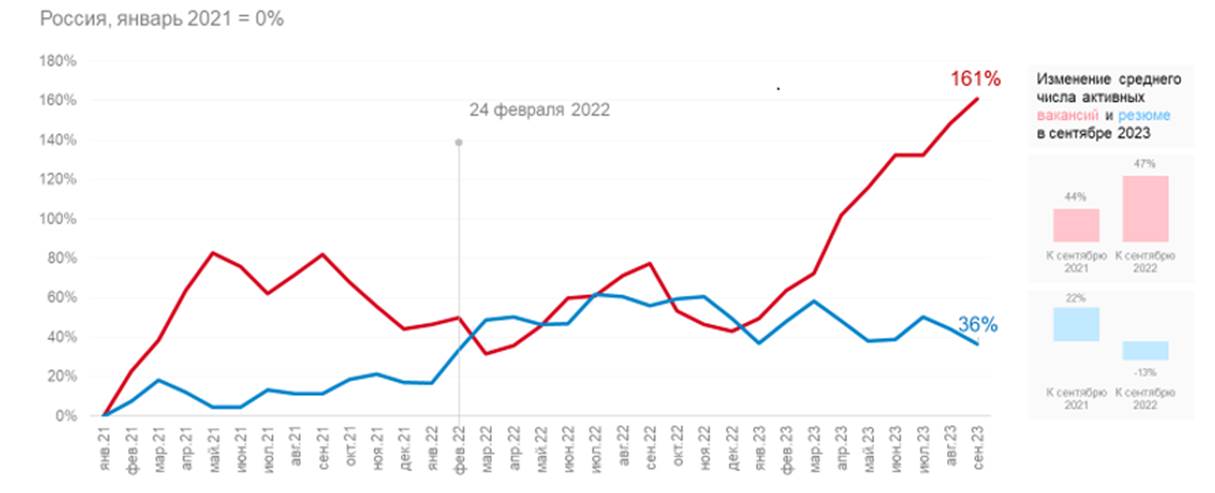 Рисунок 2 – Динамика среднего числа активных вакансий и резюме на рынке в сфере «Туризм. Гостиницы. Рестораны», в % к январю 2021 г.