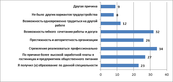 Среди основных причин выбора организаций индустрии гостеприимства для молодых людей выступили стремление реализоваться профессионально (34%) и возможность гибкого сочетания работы и досуга (32%). Следовательно, молодые люди выбрали ту сферу деятельности, где им действительно интересно работать. Кроме этого, трудовая деятельность в этой отрасли обеспечивает им гибкость занятости, когда можно сбалансировано сочетать досуг и работу, что в настоящее время приобретает все большую ценность как среди молодежи, так и среди людей более старшего возраста.