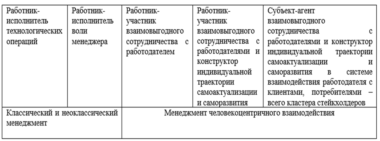 В авторском видении человекоцентричная технология – технология, направленная на формирование траектории самоактуализации и саморазвития работника как субъект-агента в системе взаимодействия работодателя с реальным, действующим кластером стейкхолдеров для оптимизации целевых ориентиров каждого участника производственного процесса. Такая формулировка связана с тем, что сегодня исследователями обращается внимание на выявленные изменения, происходящие на фундаментальном уровне в отношениях «работодатель – работник» в процессе внедрения человекоцентричных технологий на крупных предприятиях (рисунок 1) [3].