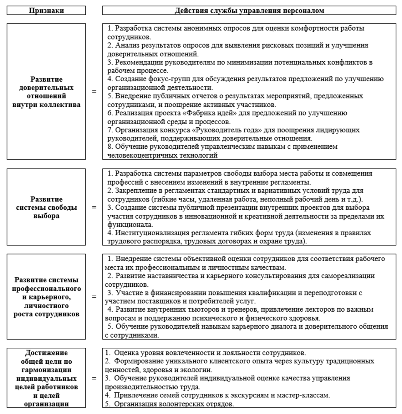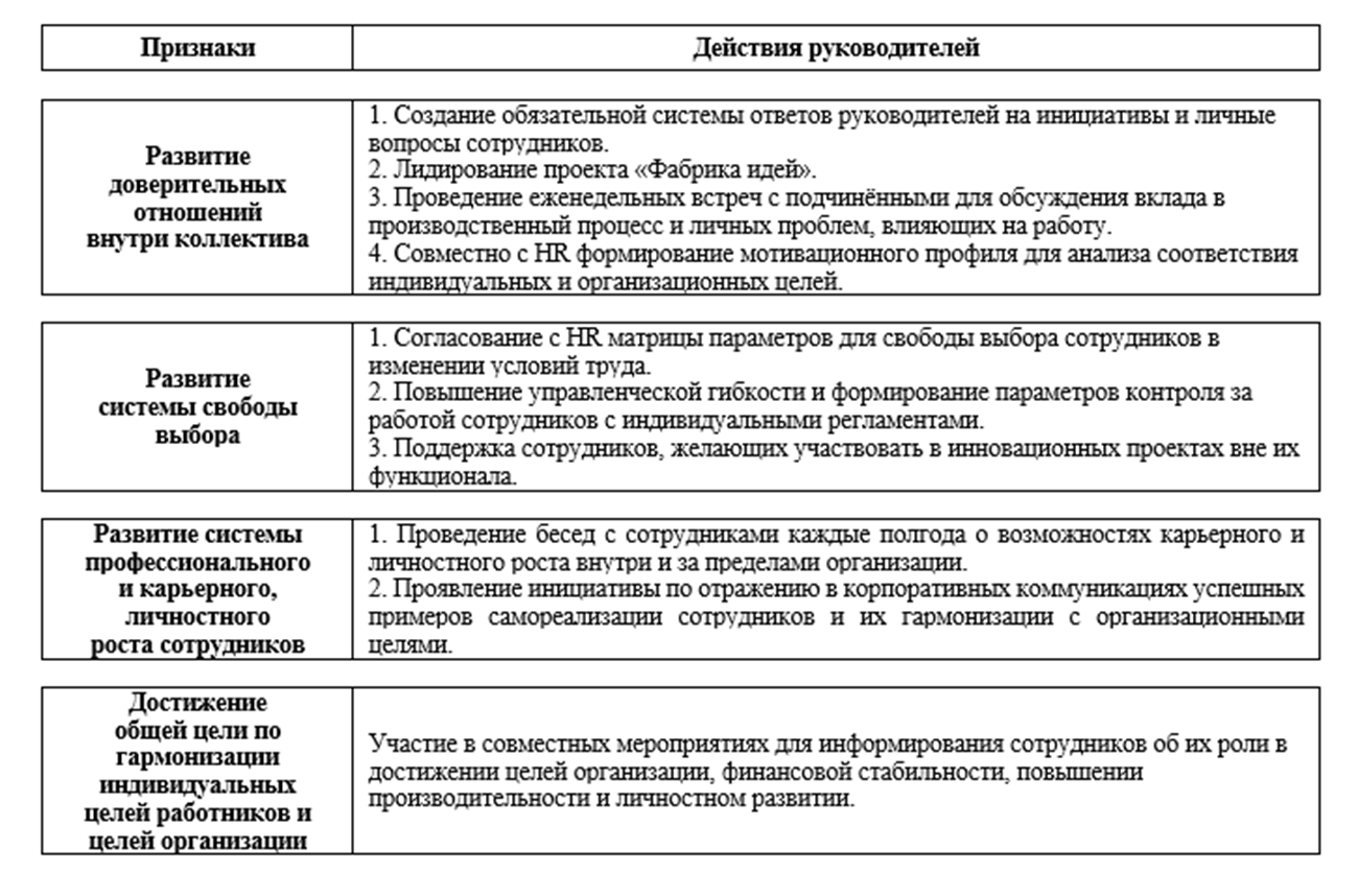 Обратим внимание на тезис Н. Лукашевича в том, что «концепция человекоцентричной организации характеризуется высокой степенью фрагментарности и находится в стадии активного формирования: понятие используется для обозначения широкого спектра идей – от конкретных управленческих практик до организационной философии. Большинство определений описывают человекоцентричную организацию как нормативную модель, которая является прямой критикой механистических, бюрократических и утилитарных взглядов на организацию. Предлагается мало системных и проработанных моделей того, как гуманистические ценности реализуются в организационных структурах и процессах, оставаясь на высоком уровне абстракции» [9]. Учитывая это, следует все-таки начинать работу по осмыслению и апробации востребованных временем практикоориентированных решений.