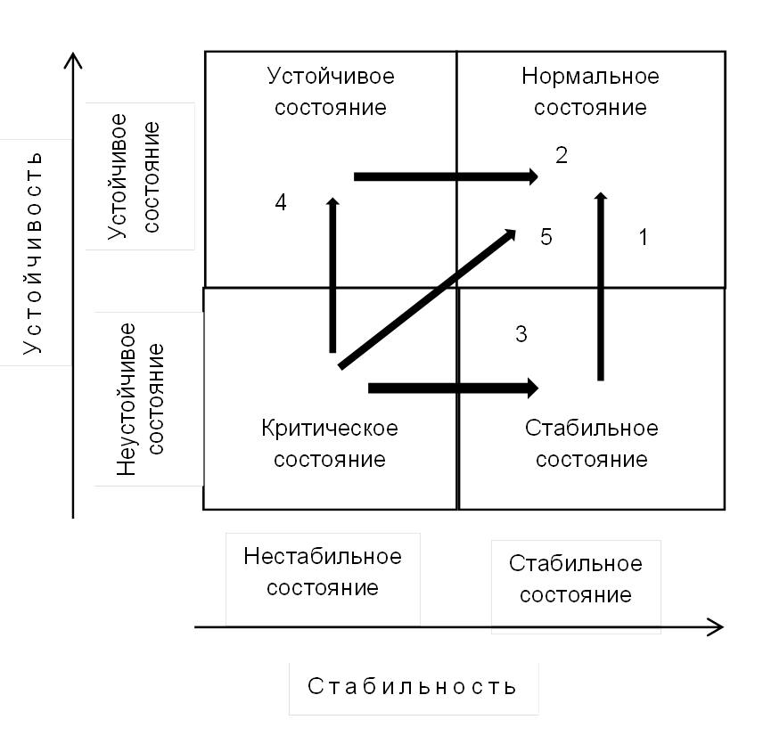 Поскольку производственная система может находиться в стабильном или нестабильном, устойчивом или неустойчивом состояниях, то возможны четыре варианта состояния производственной системы (рисунок 1).