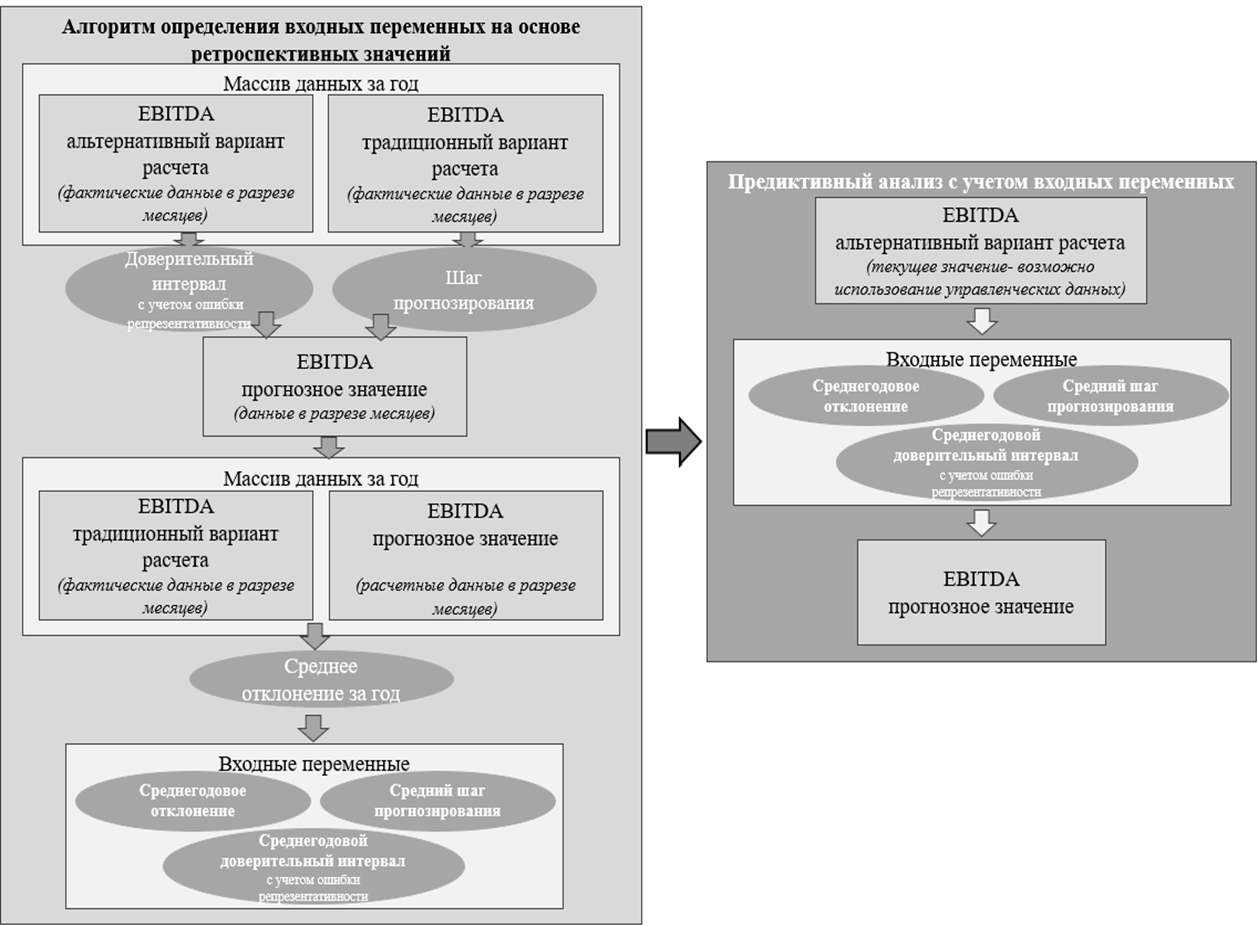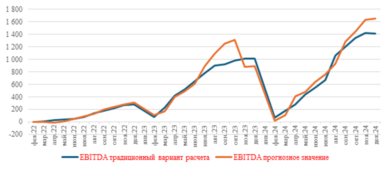 Вышеизложенные аналитические данные подтверждают работоспособность авторского метода расчета предсказательной аналитики. Отметим, что с 2021 года данная методика внедрена в тактическом управлении исследуемого предприятия. На основе оперативных данных «EBITDA» по альтернативному варианту расчета формируется еженедельно, что дает возможность сигнализировать о предстоящих финансовых результатах и своевременно провести предупреждающие действия, такие как переориентир ассортиментного портфеля, оптимизация затрат, пересмотр ценовых ориентиров и другие управленческие решения.