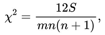 где W – значение коэффициента конкордации, принадлежит закрытому интервалу [0;1]; S – сумма квадратов отклонений суммы m рангов от их средней величины; n – число статистических наблюдений. Значимость полученного значения коэффициента конкордации, в свою очередь, определяется на базе критерия χ2, который рассчитывается по следующей формуле [15]: