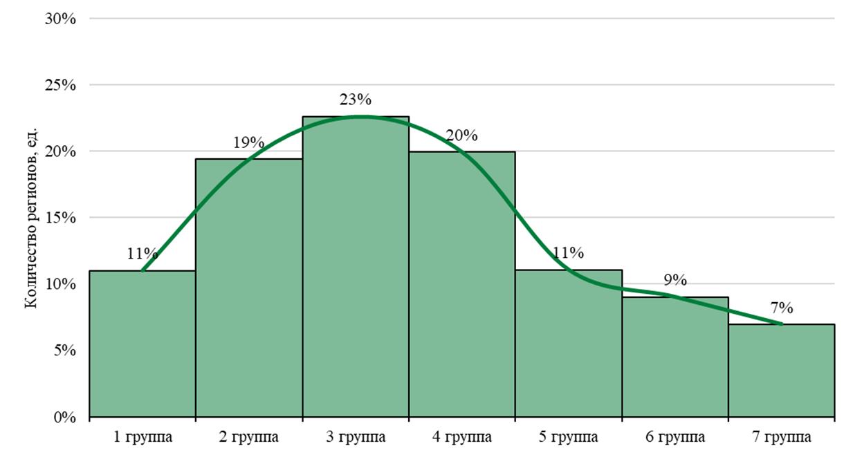 Гистограмма демонстрирует форму распределения, приближенную к нормальной, с правосторонней асимметрией. Это свидетельствует о том, что для совокупности российских регионов характерна концентрация относительно низких значений производительности труда. Более половины регионов (группы 1–3, суммарно около 55%), в целом, показывают уровень ниже среднего, в то время как регионы с высокой и очень высокой производительностью труда (группы 6 и 7) формируют «хвост» распределения, составляя в совокупности менее 20% от общего числа регионов.