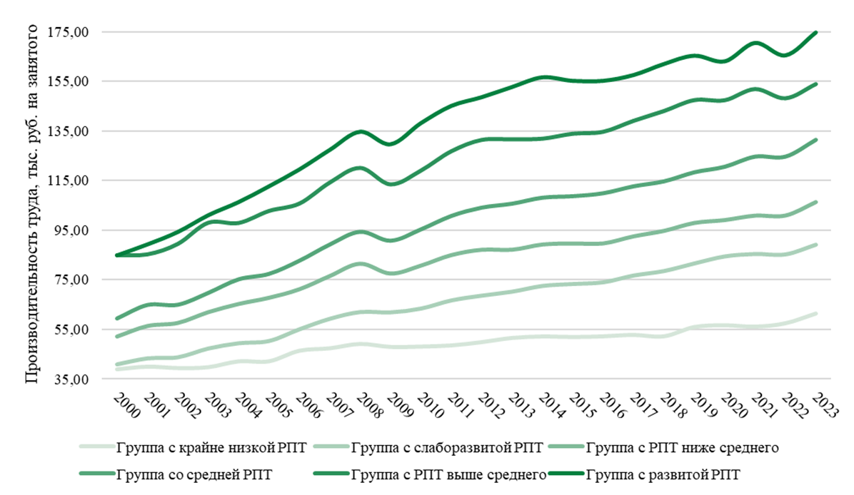 Современные научные публикации в сфере региональной экономической политики свидетельствуют о том, что для устойчивого развития национальной системы (государства) требуется устойчивое, выравненное развитие его региональных (территориальных) подсистем [16]. Реализация экономической политики, направленной на выравнивание экономического состояния регионов, должна способствовать экономической стабильности при прочих равных условиях или по меньшей мере снижать эффект неустойчивости подсистем и системы, в целом, при влиянии экзогенных факторов. В этой связи управление региональной производительностью труда (далее – РПТ) является одним из направлений, на которых может быть построена эффективная государственная и региональная экономическая политика, создающая условия стабилизации и дальнейшего устойчивого развития национальной системы.