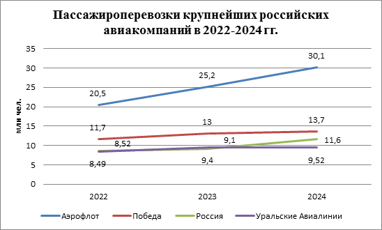 Рисунок 1 – Пассажироперевозки крупнейших российских авиакомпаний в 2022-2024 года [1].